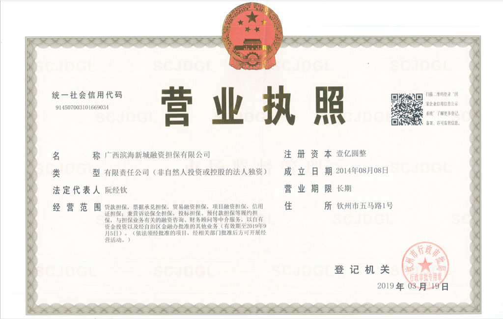 根據(jù)原廣西壯族自治區(qū)金融工作辦公室《廣西壯族自治區(qū)金融工作辦公室關(guān)于印發(fā)2018年全區(qū)融資擔(dān)保公司現(xiàn)場(chǎng)檢查工作方案的通知》(桂金辦融函〔2018〕106號(hào))的整改要求,我擔(dān)保公司立即展開(kāi)公司名稱(chēng)的變更工作。經(jīng)欽州市行政審批局同意,于2019年3月19日完成公司名稱(chēng)的變更并取得新?tīng)I(yíng)業(yè)執(zhí)照,變更后的名稱(chēng)為“廣西濱海新城融資擔(dān)保有限公司&...