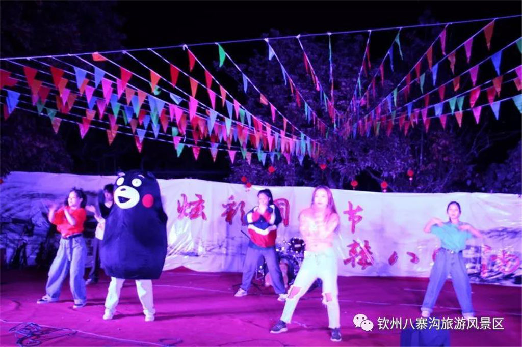 國慶期間景區(qū)舉辦以“炫彩國慶節(jié),玩轉(zhuǎn)八寨溝”為主題的系列活動(dòng)受到眾多游客親睞。游客們白天可以觀看精彩歌舞文藝演出,玩真人CS運(yùn)動(dòng),品嘗各種各樣的特產(chǎn)美食,學(xué)制作欽州坭興陶,體驗(yàn)欽州第一漂—八寨溝森林漂流,登山徒步暢游山水,呼吸新鮮空氣,天然水潭戲水其樂無窮,整個(gè)景區(qū)一片游客如織、喜樂融融的景象。