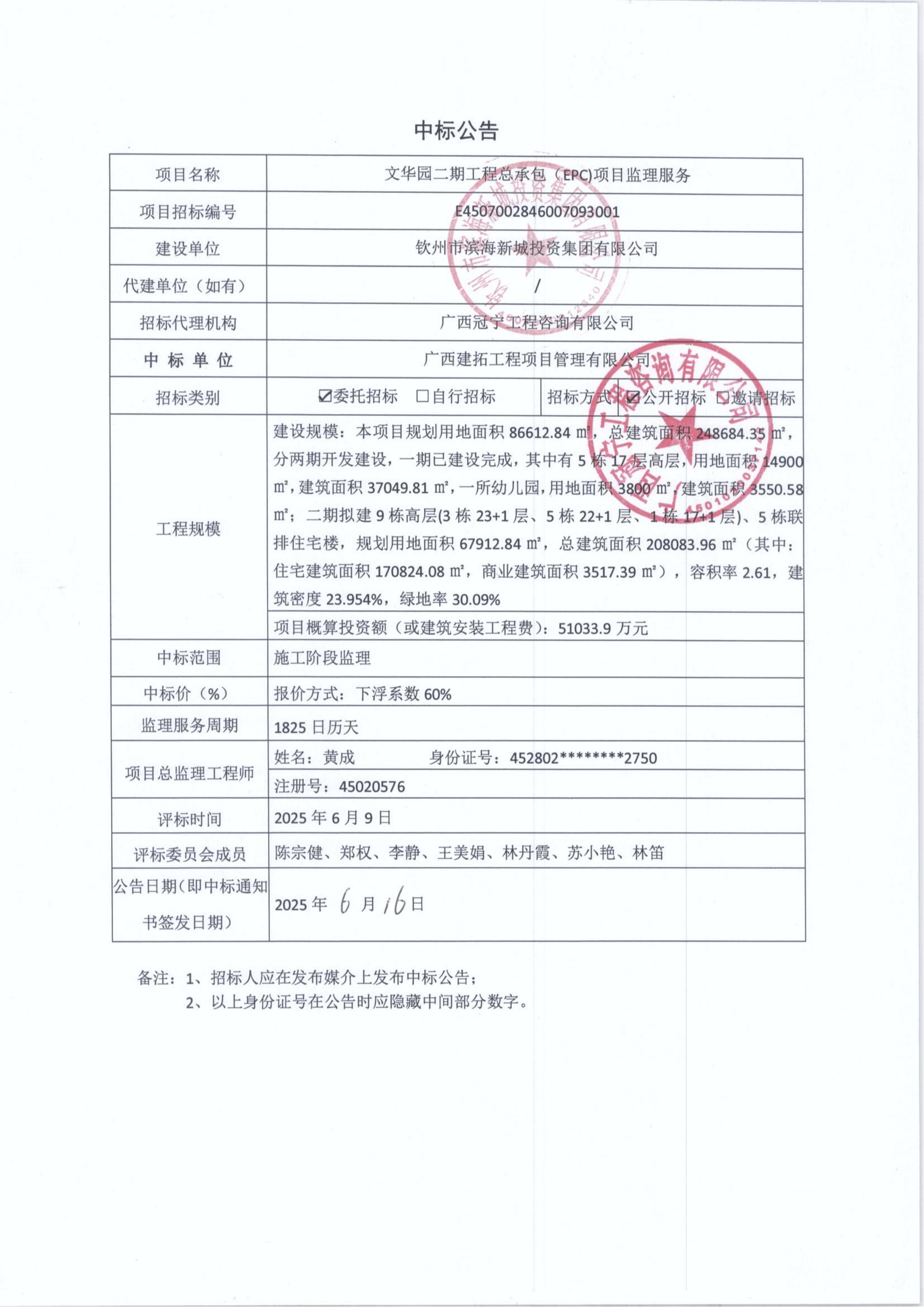 中標(biāo)公告文華園二期工程總承包(EPC)項目監(jiān)理服務(wù)