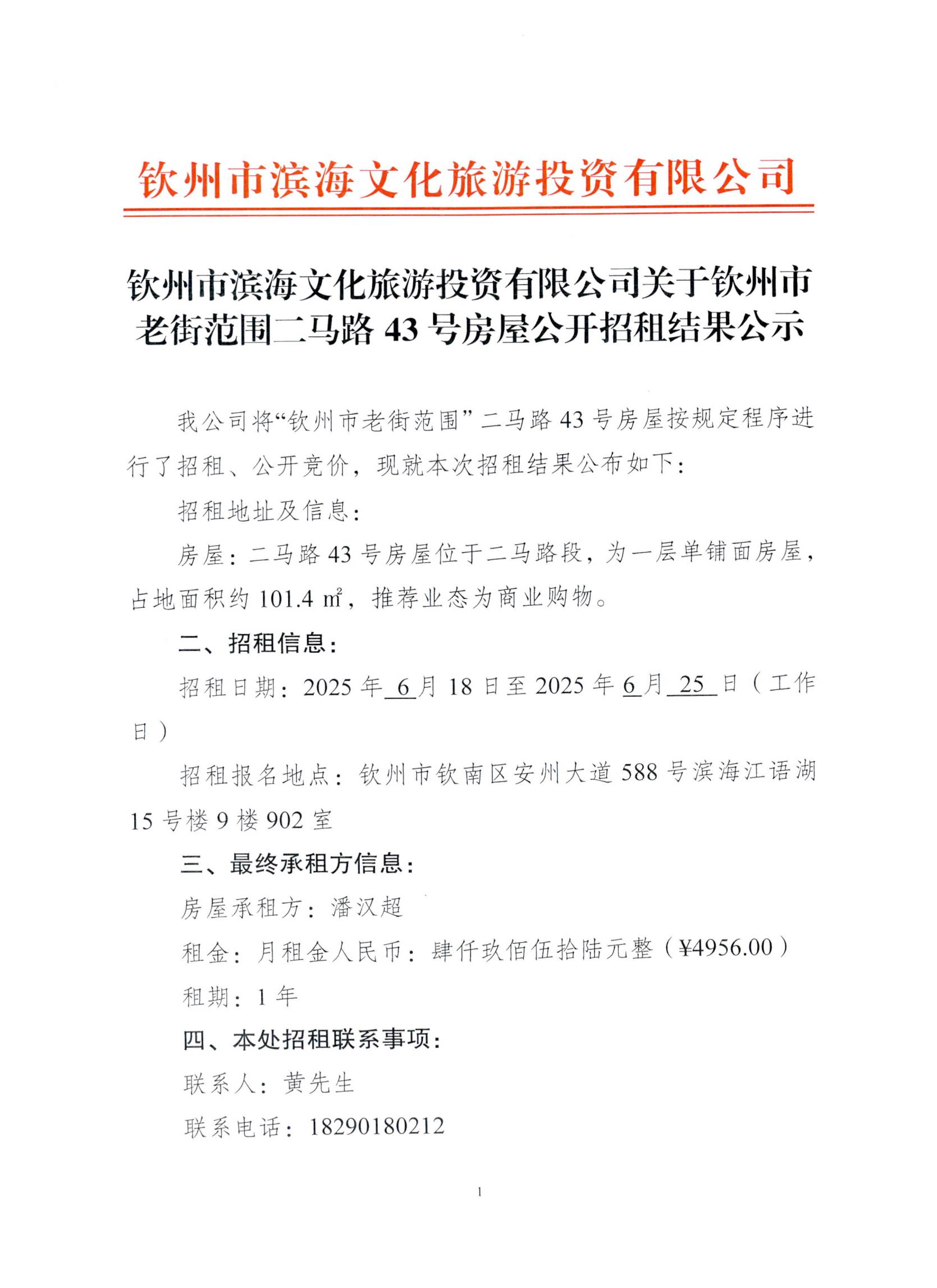 欽州市濱海文化旅游投資有限公司關(guān)于欽州市老街范圍二馬路43號房屋公開招...
