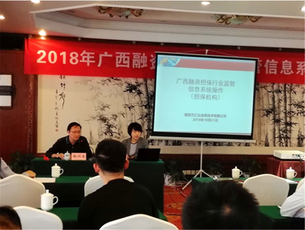 2018年10月31日,由自治區(qū)金融辦組織,在桂林榕湖飯店由系統(tǒng)設(shè)計方南京萬匯弘信息科技有限公司負責人陳月對廣西融資擔保行業(yè)監(jiān)管信息系統(tǒng)操作進行培訓。