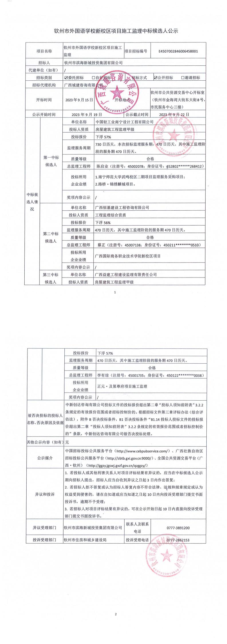 欽州市外國語學(xué)校新校區(qū)項目施工監(jiān)理中標(biāo)候選人公示