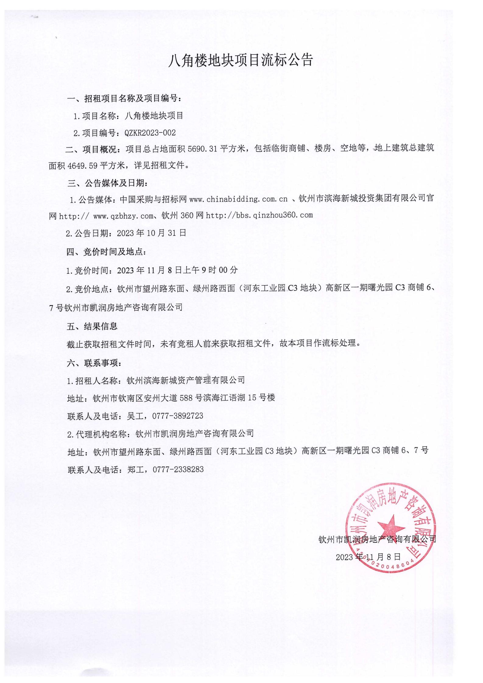 欽南區(qū)尖山街道辦九鴉村委國有收儲土地(蝦塘)部分出租(QZKR2023-008)流標(biāo)公告