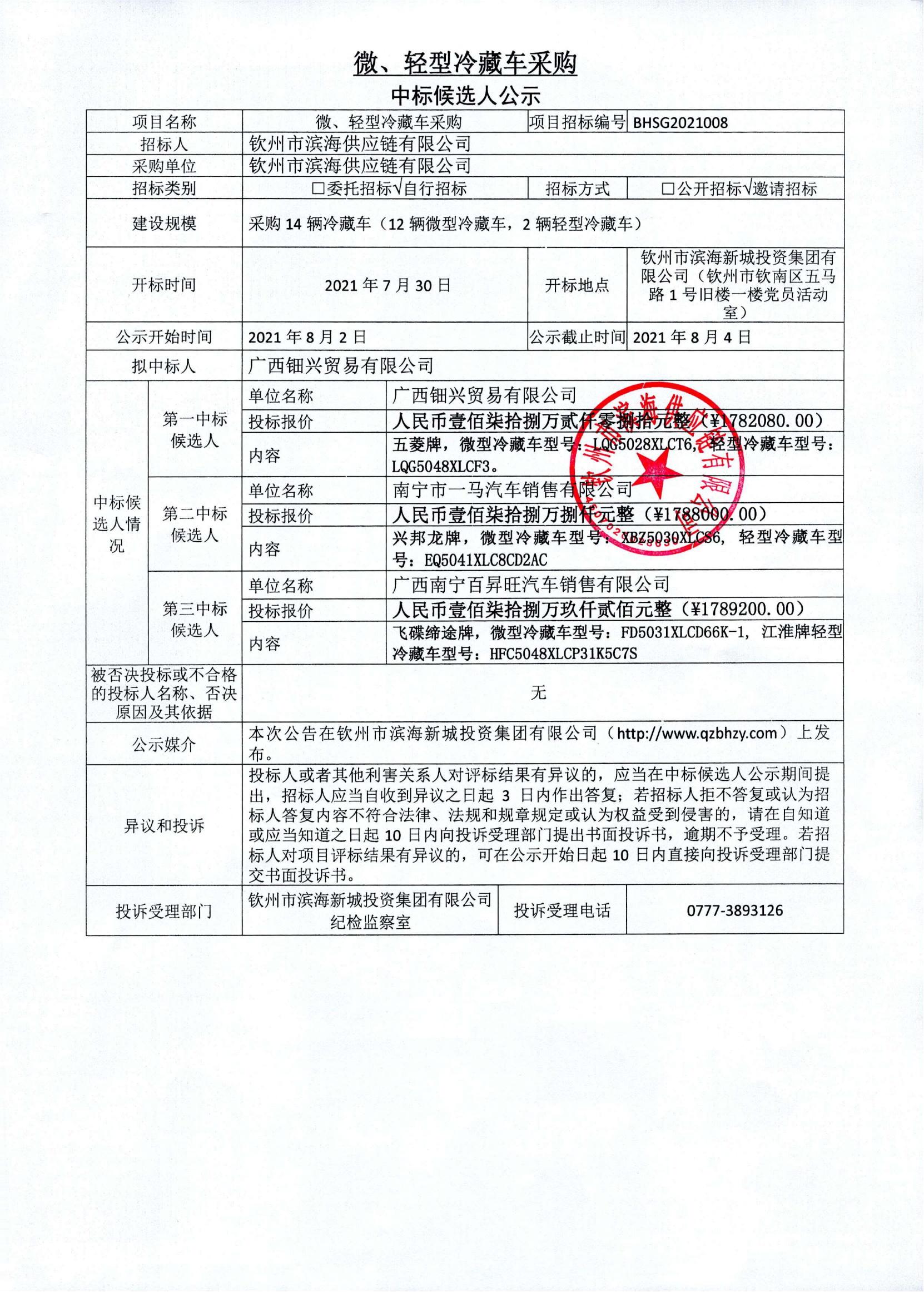 微、輕型冷藏車(chē)采購(gòu)中標(biāo)候選人公示