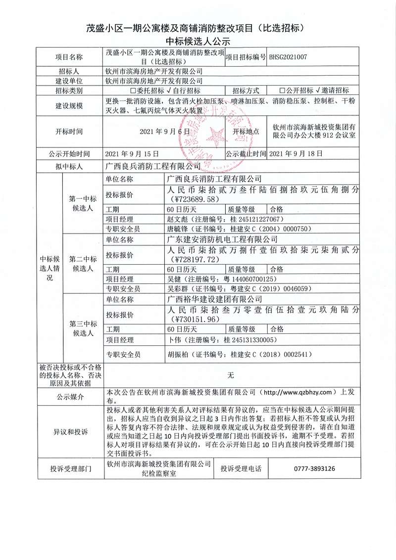 茂盛小區(qū)一期公寓樓及商鋪消防整改項(xiàng)目(比選招標(biāo))中標(biāo)候選人公示