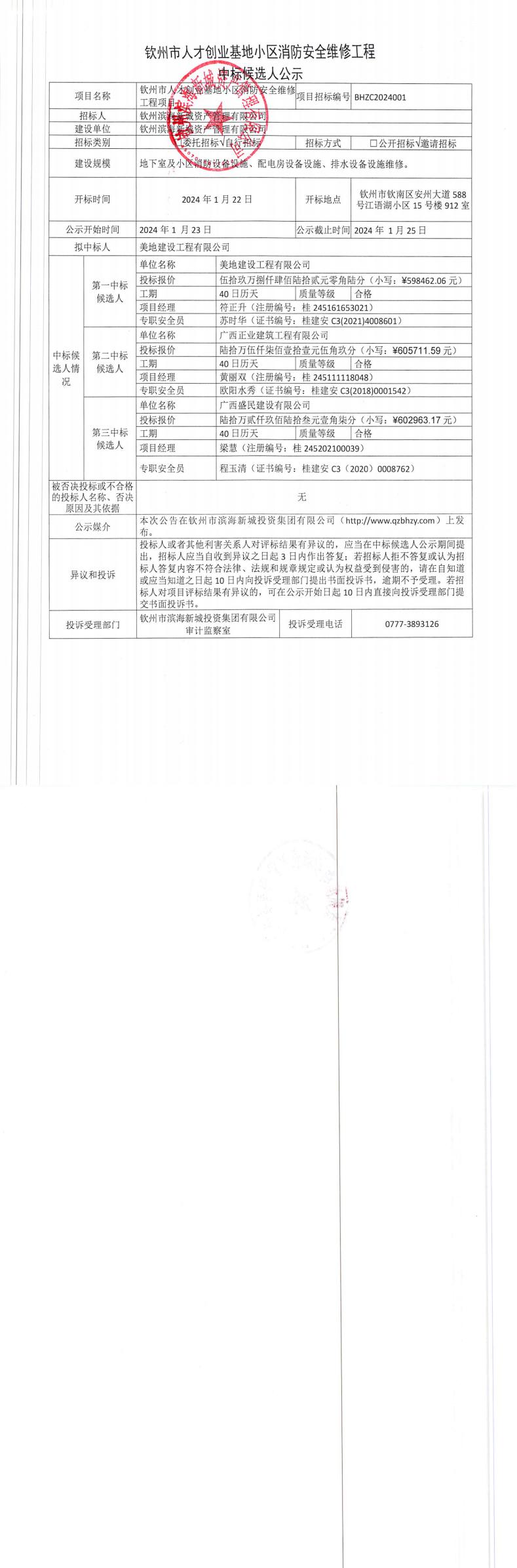 欽州市人才創(chuàng)業(yè)基地小區(qū)消防安全維修工程中標(biāo)候選人公示